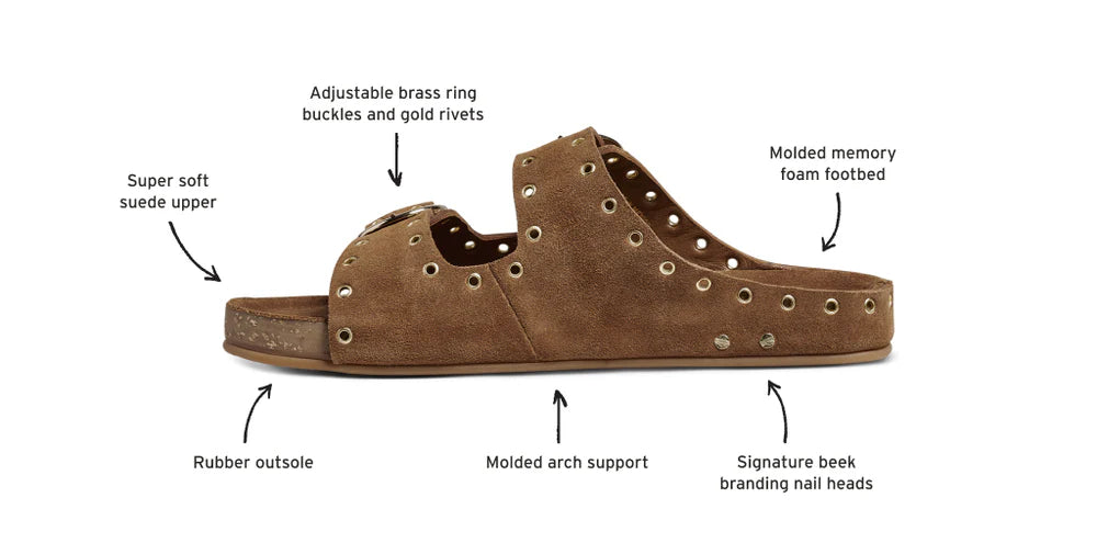 Now this is how we transition to Fall! Cozy up to cooler days in the CEDAR suede slide sandal. With a plush suede-lined footbed layered over memory foam, every step is cushioned in comfort. The molded footbed gently contours to your foot for all-day arch support. The suede upper features two fully adjustable suede straps finished with sleek buckles and brass rivets that allow for a customizable fit with a modern touch of hardware.
