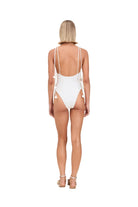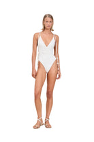 The Carmella is a V-cut full-piece with adjustable shoulder straps, rouching details in the center front, and petal detailing at the ends of the straps. Moderate back coverage.