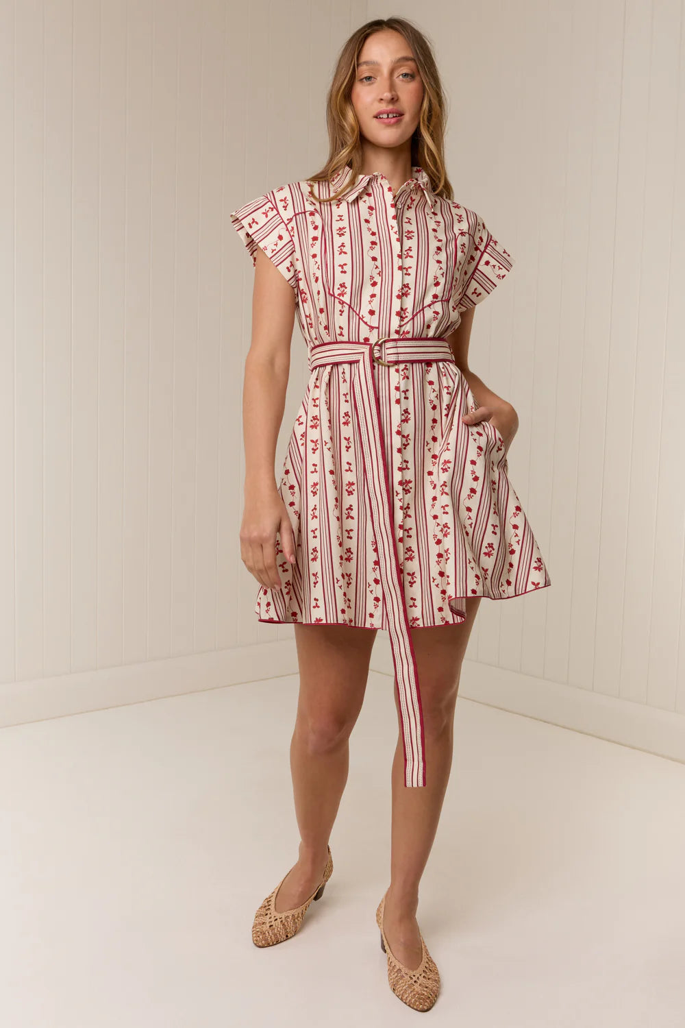 The Manon Mini Dress is crafted from a premium Linen blend, printed in our exclusive hand-drawn Raye Fleur print. Featuring a structured point collar and adjustable D-ring belt, the Manon Mini Dress offers a structured silhouette, finished with a western-style yoke and contrast piping for a relaxed yet elevated look. Please refer to our size and fit guide for further fit details.