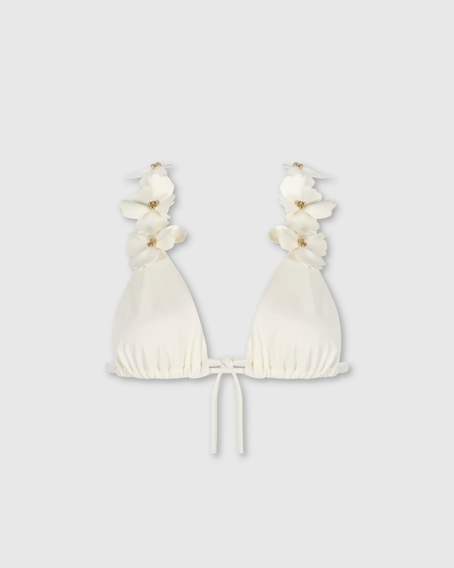 The Flore top brings a delicate twist to a classic triangle silhouette. Adjustable straps adorned with 3D flowers lend a fresh and charming touch to this minimalist, timeless piece.