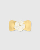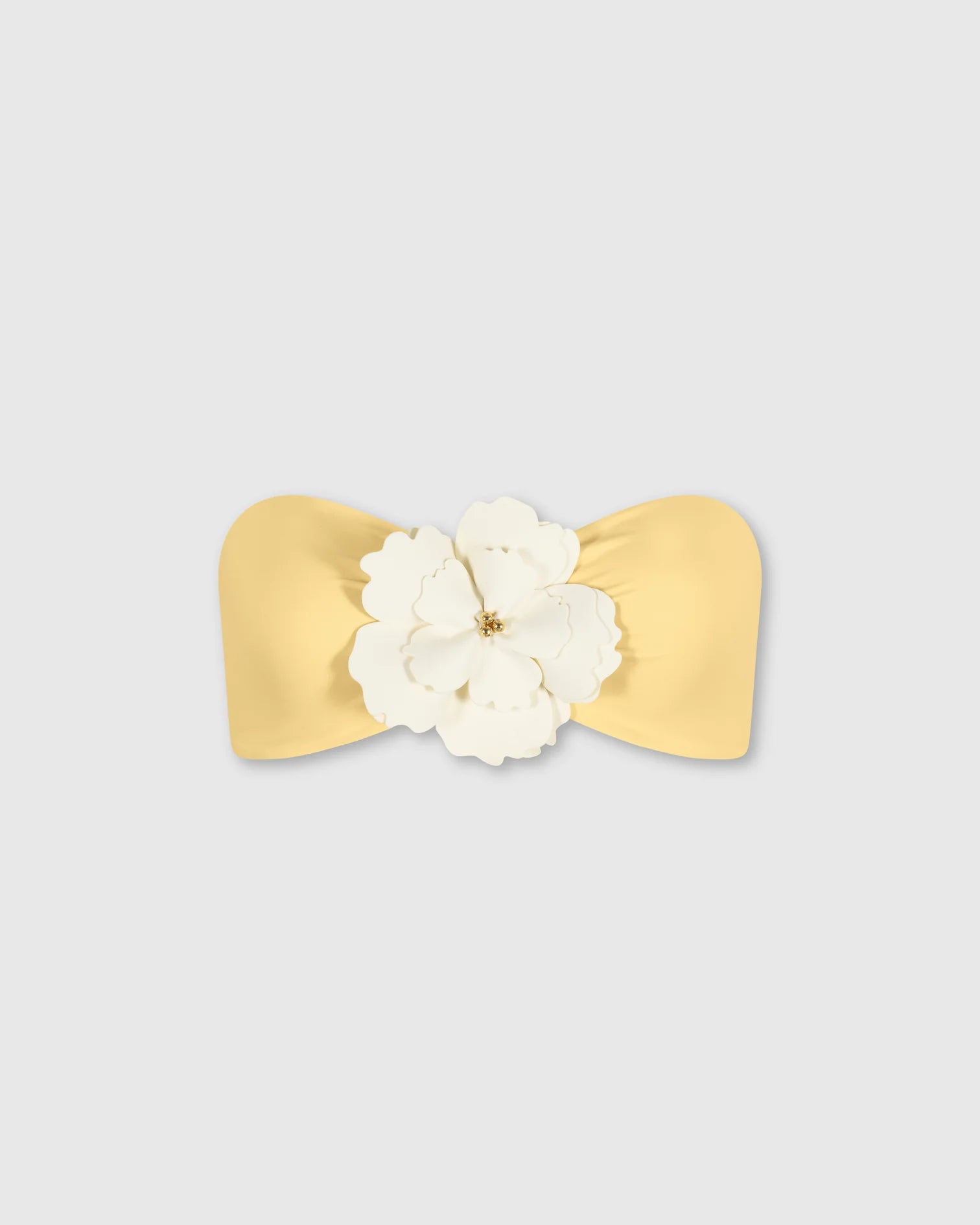 The Maia top is a fresh and elegant piece, perfect for sunny days. Its bandeau shape is enhanced by a 3D flower that highlights the central ruching, adding texture and a distinctive touch. A refined staple, pair it with the Naomi one piece for a polished, city-ready look