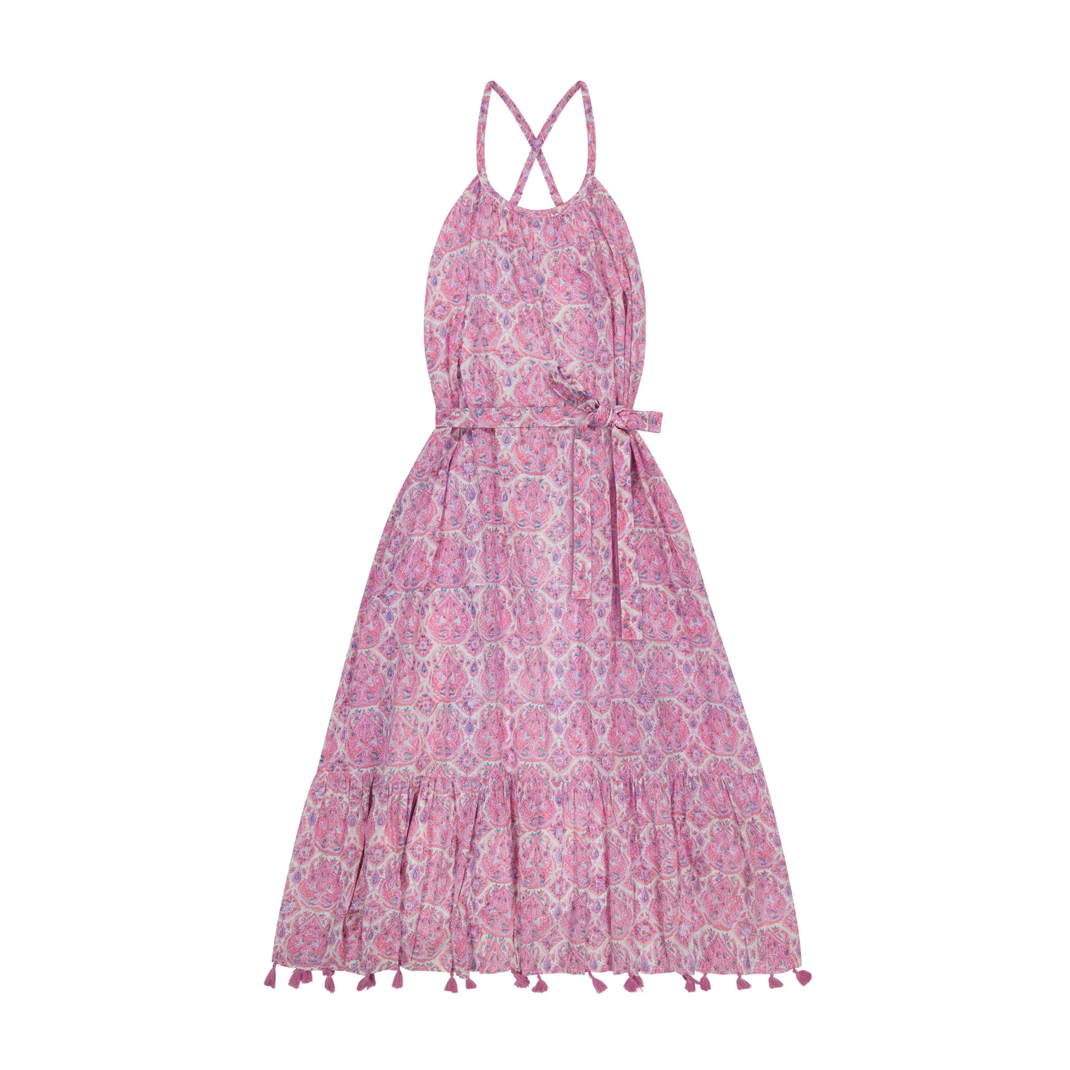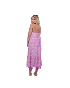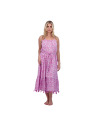 100% cotton. Maxi length (approx 54 inches), adjustable straps, self belt.