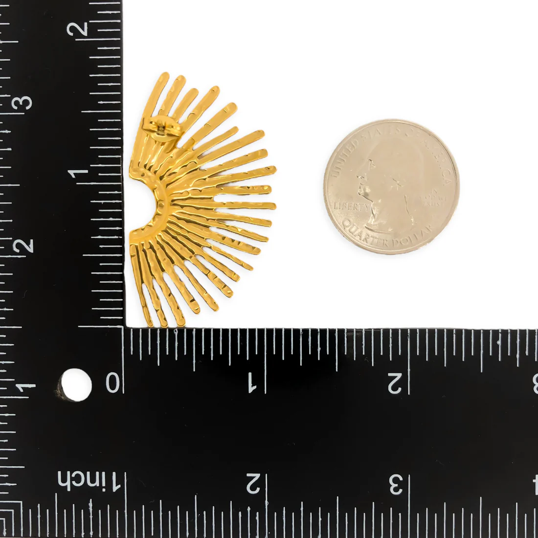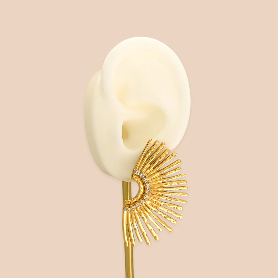 Enhance your elegance with these sunburst earrings that are accented with multiple thin, elongated spokes radiating outward from the center. The inner curve of each earring is complete with a row of small, sparkling cubic zirconia that add a touch of glamour and brilliance.