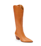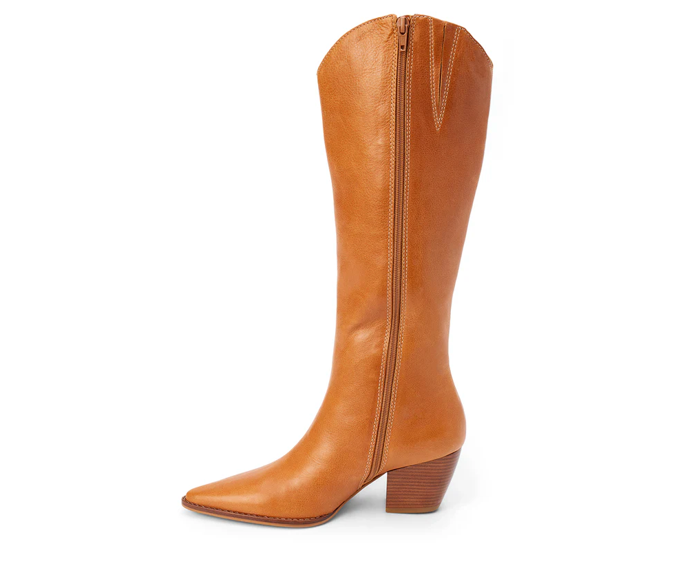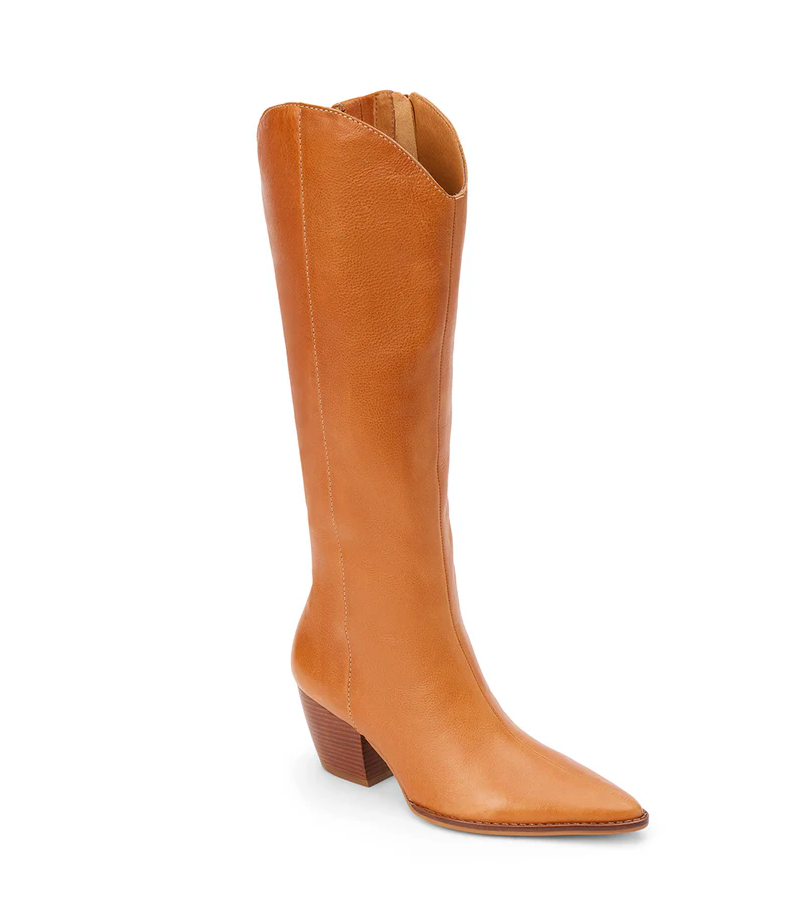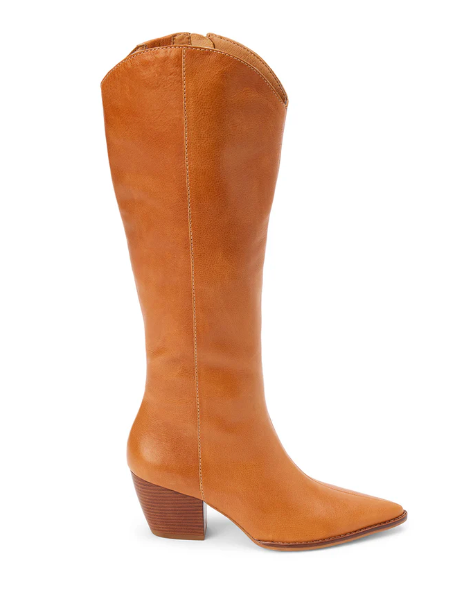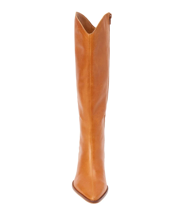 Tall Western-inspired boot with pointed toe, curved top shaft, and angled block heel.