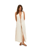 he ViX Iva Long Cover Up is a relaxed linen-blend silhouette with a plunging V-neckline framed by contrast beige trim. Deep side armholes are accented with gold-plated bar details, while button closures along the front offer a refined finish.