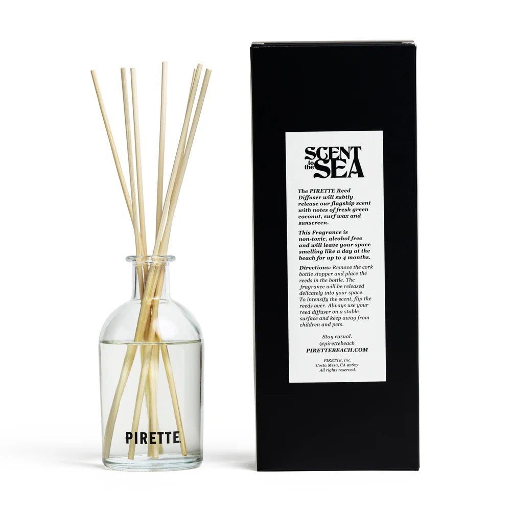 PIRETTE Reed Diffuser will subtly release our flagship scent with notes of fresh coconut, surf wax, sunscreen, and that sun-washed feeling after a day at the beach. This classic Boston round bottle comes with with eight bamboo reeds and will transform any space into a beach day.
