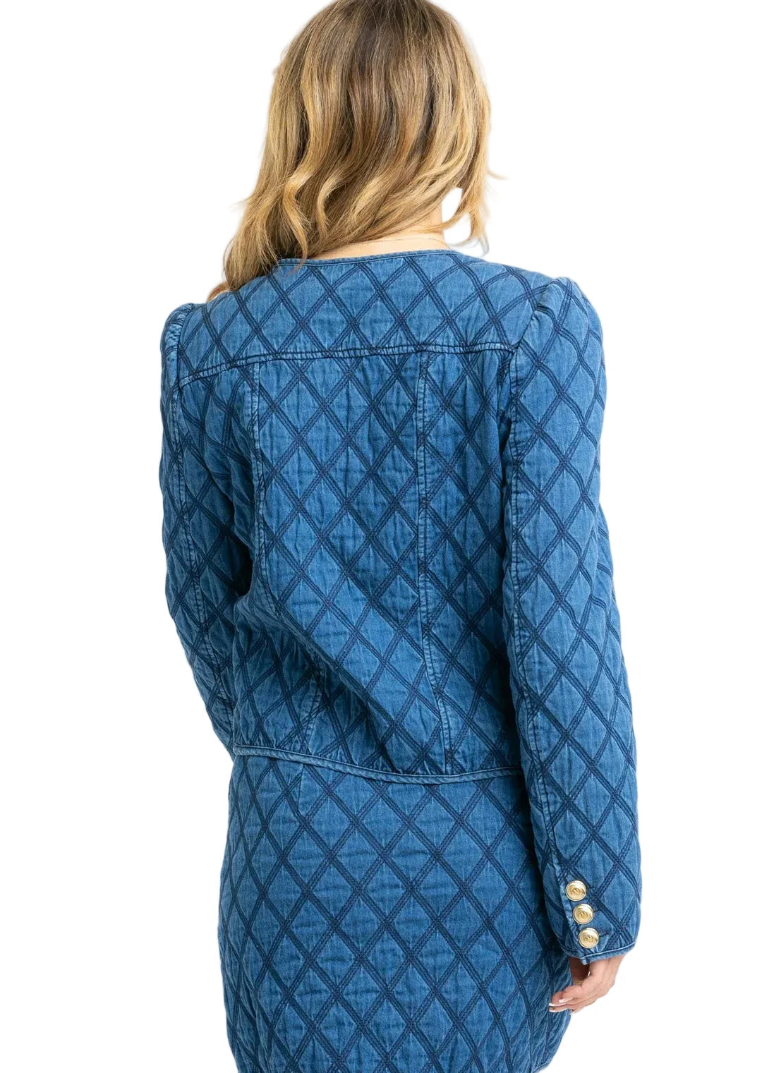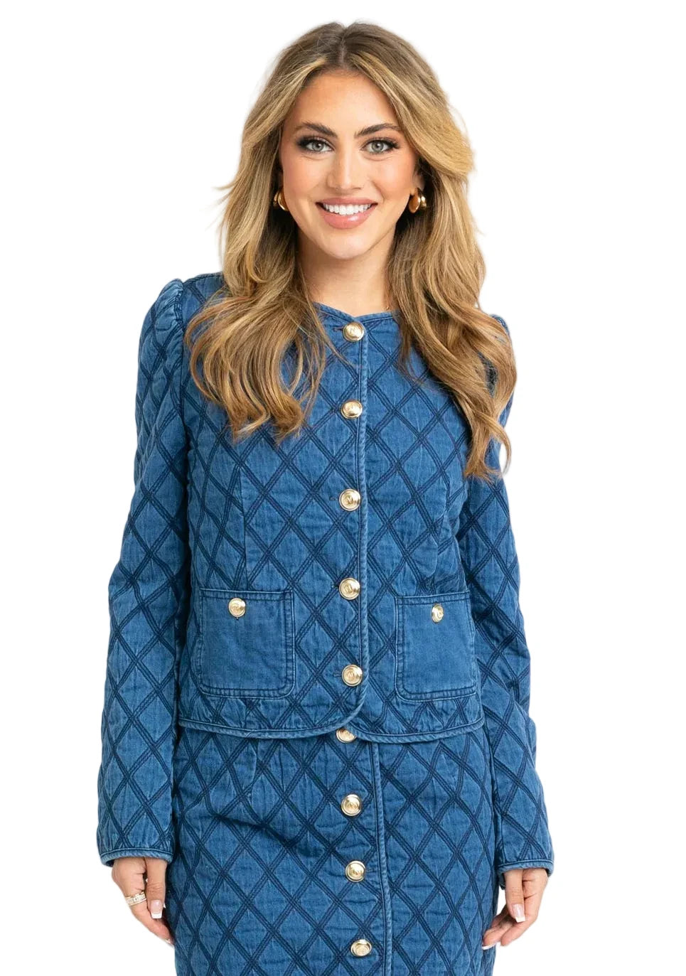 This denim skirt has a unique diamond pattern with golden buttons that give it such a chic touch! Pair with the Denim Stitch Novelty Jacket for the perfect set!