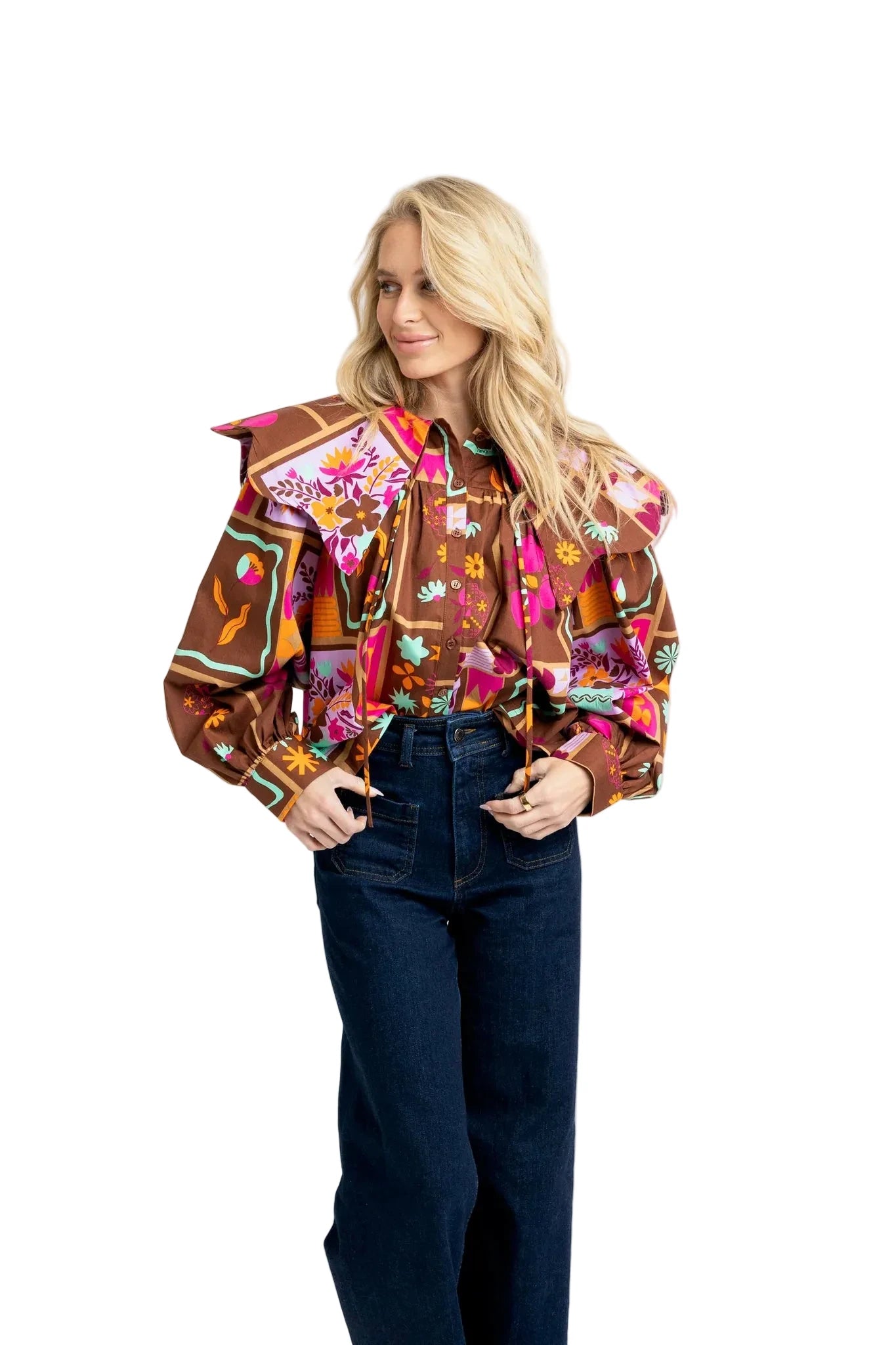 The Karlie Floral Frame Collar Top brings a charming touch to your wardrobe with its delicate scalloped collar detail. Featuring a playful floral print, this top effortlessly combines feminine elegance with a fun, fresh vibe—perfect for brightening up any outfit. Its flattering design makes it an easy choice for both casual outings and stylish gatherings.