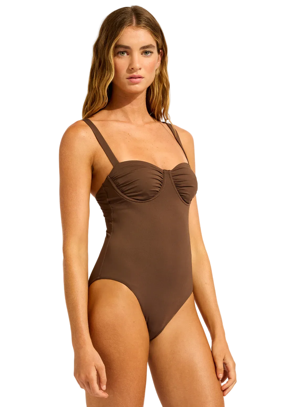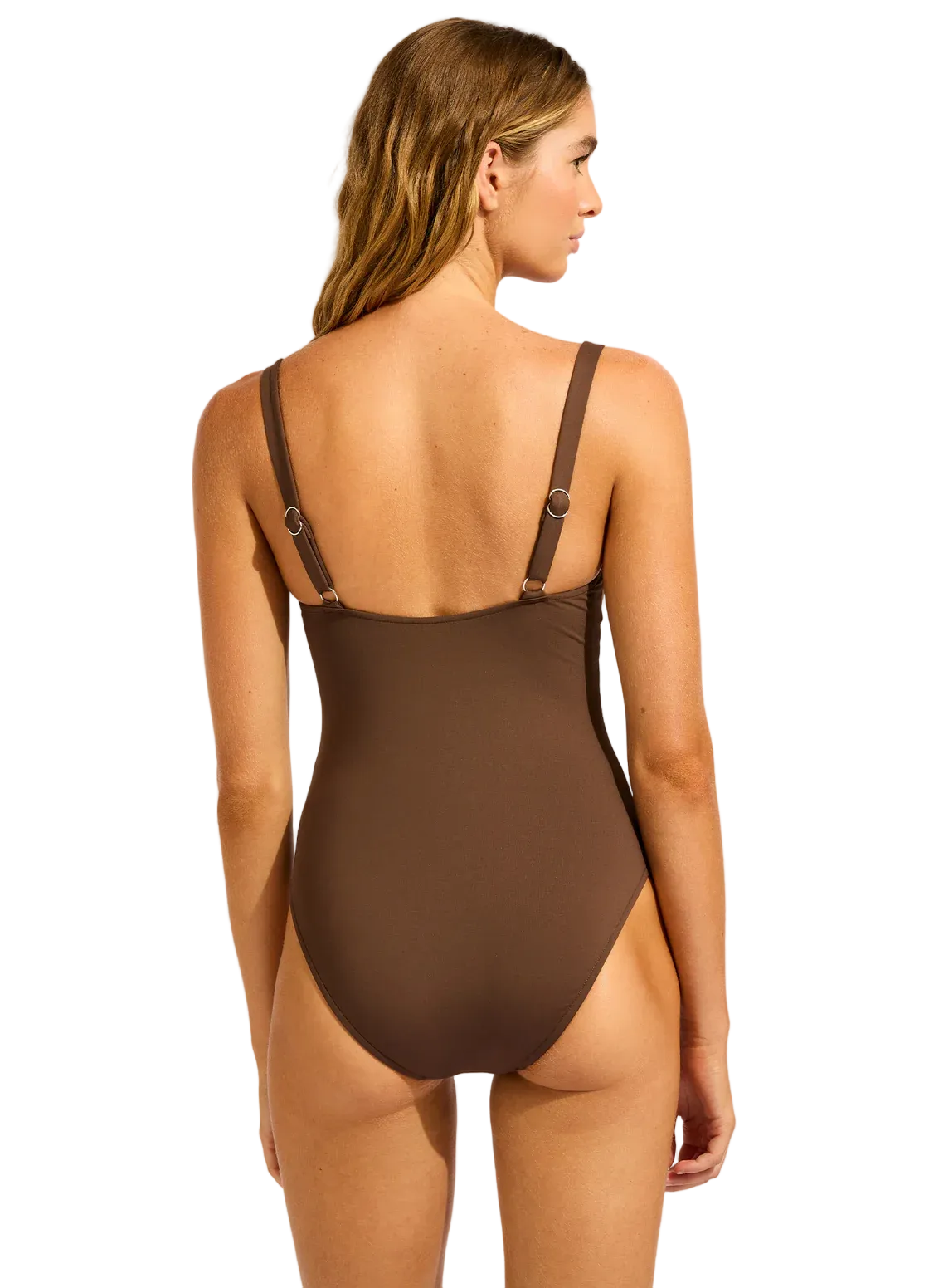 Micro Gingham Square Scooped Neckline One Piece - Brown