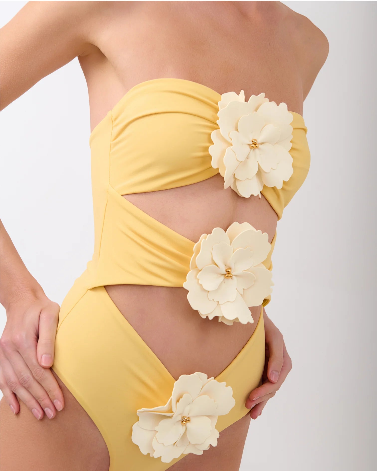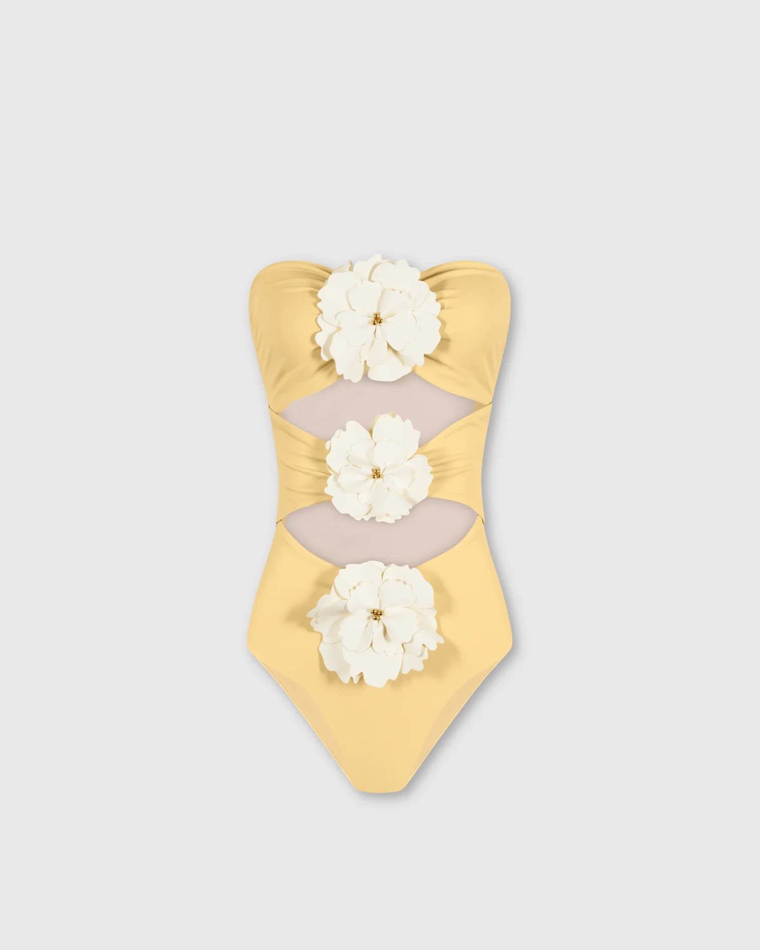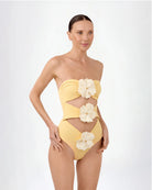 The Maia one piece is a must-have that naturally balances sensuality and elegance. This strapless design features three strategically placed cut-outs along the front, framed by 3D flowers that flatter the silhouette and add a signature detail to this modern, structured style