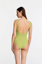 The Palm Springs Maillot is easily reversible, cut out the loosely stitched sizing tag to easily wear on both the Serpentine or Air side.