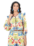 This blouse features a tropical motif with blue flowers, green palm leaves and red parrots. It has a V-neckline with a front tie closure, and ruffled cap sleeves.
