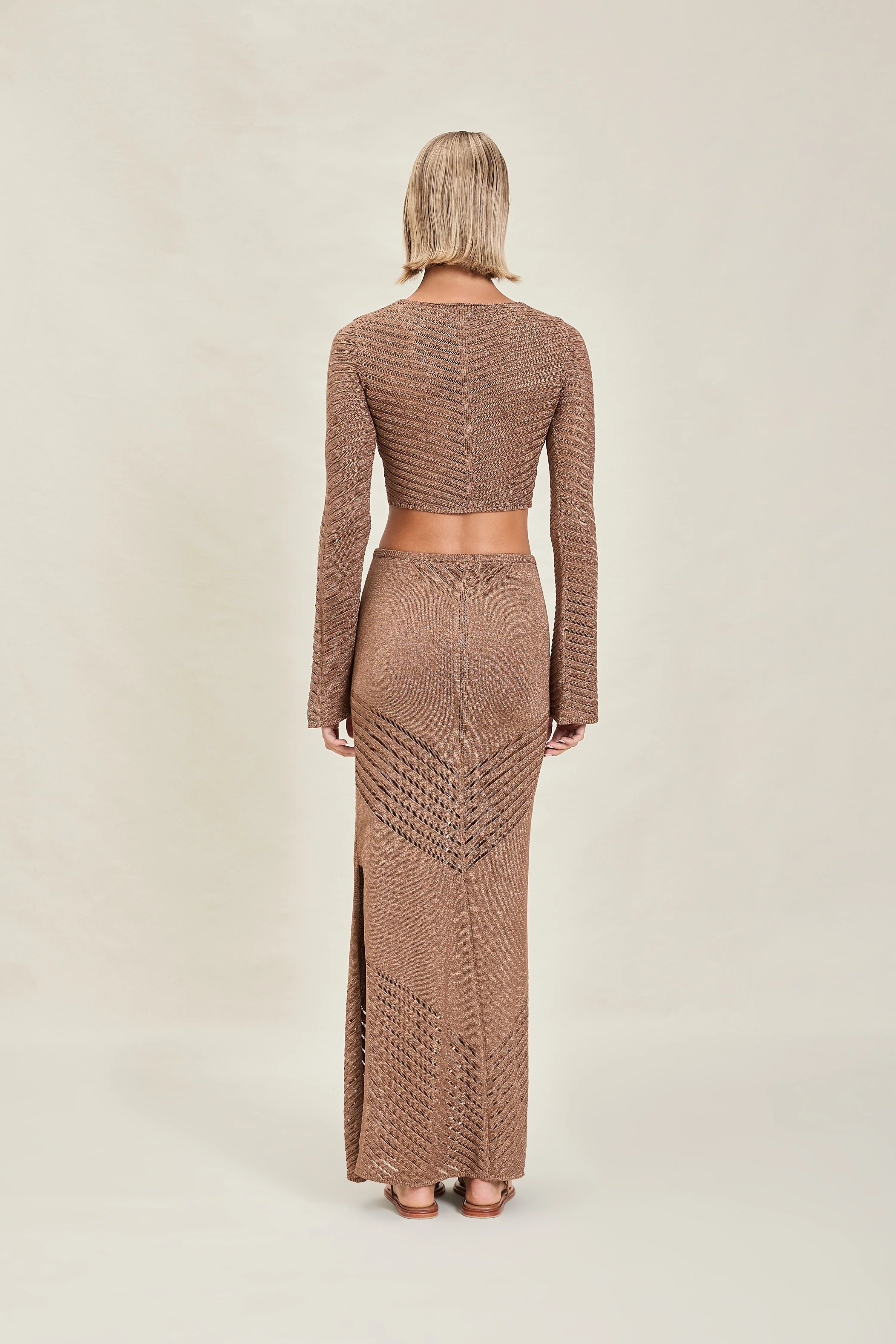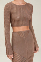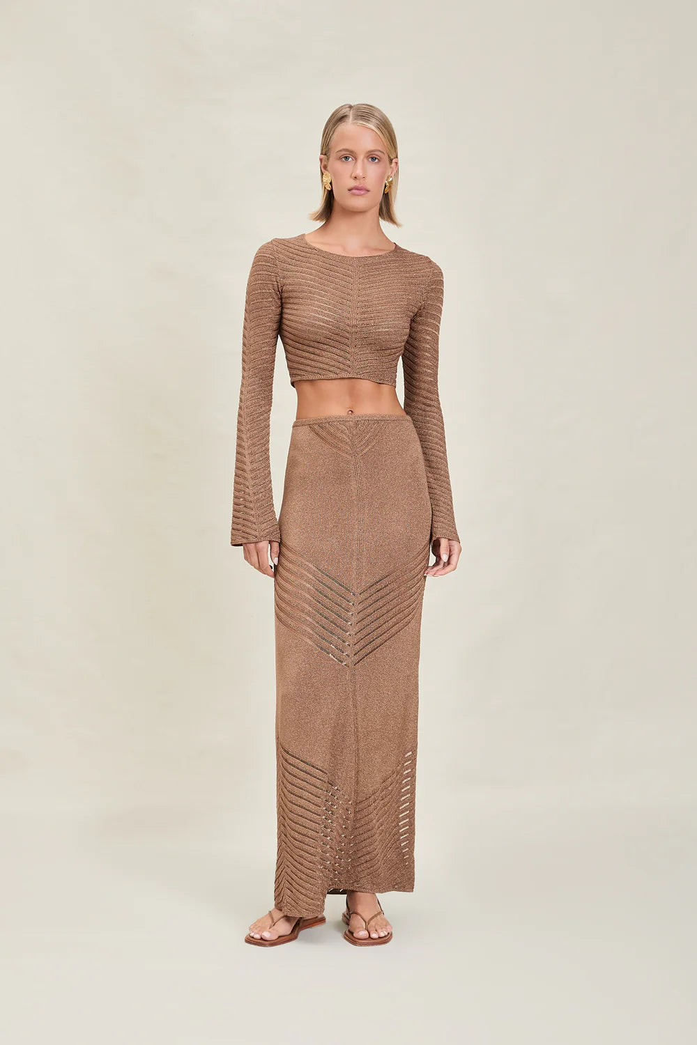 The Raya is a metallic knit crew neck top with long-bell sleeves. This crop tops pairs back perfectly with the Bria Skirt.