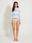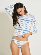 This rash guard features soft, stretchy fabric, long sleeves, cropped length, and mock neck for comfortable coverage and sun protection ideal with water activities and the beach.