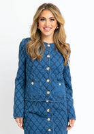 This jacket features a stylish quilted pattern with a classic round neckline and a row of elegant gold buttons. The design is completed by its dark blue color. Pair with the Denim Stitch Novelty Skirt for more elevated look!