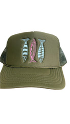 -Olive: Olive hat with blue & pink fish