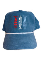 -Denim: Denim hat with Red, White, Blue fish