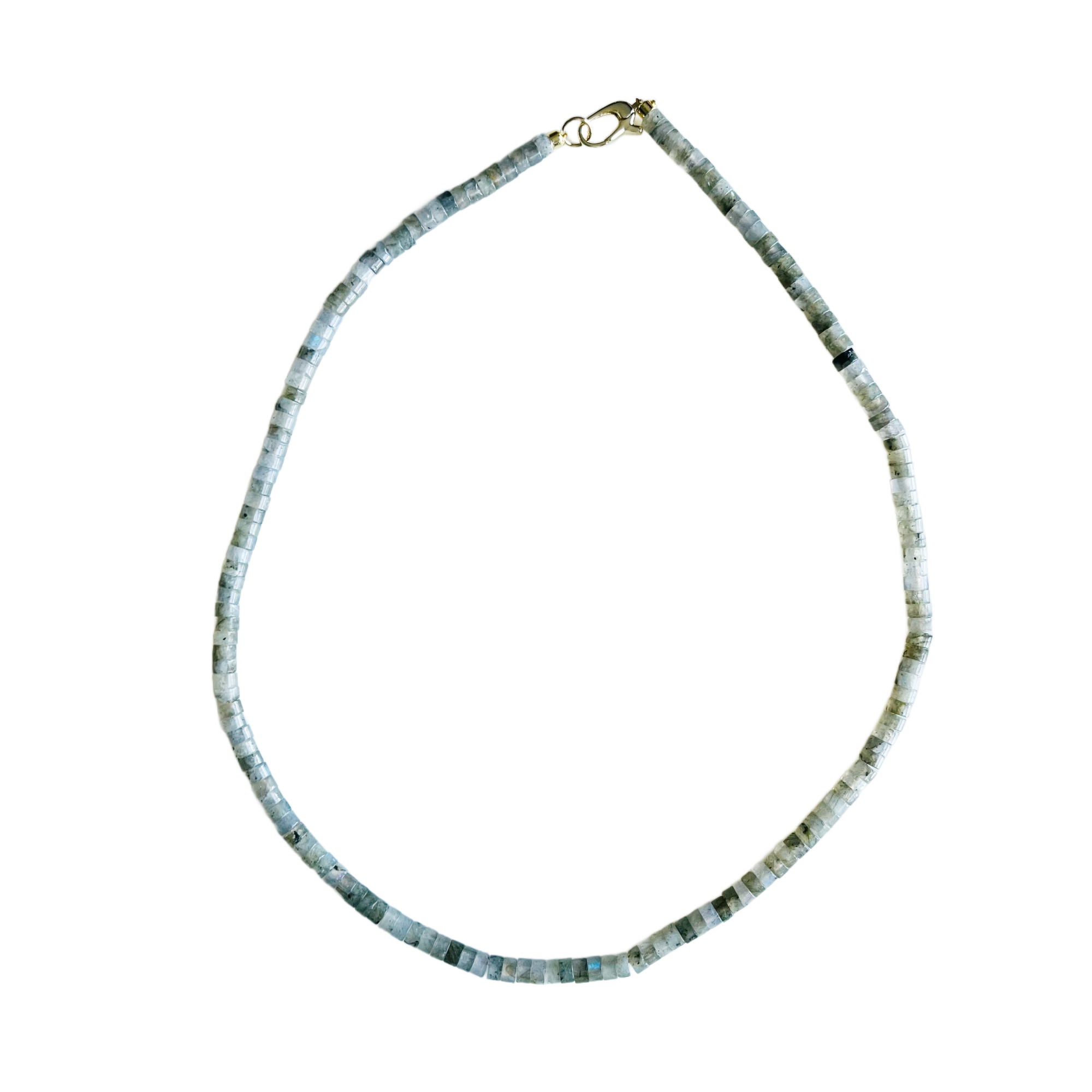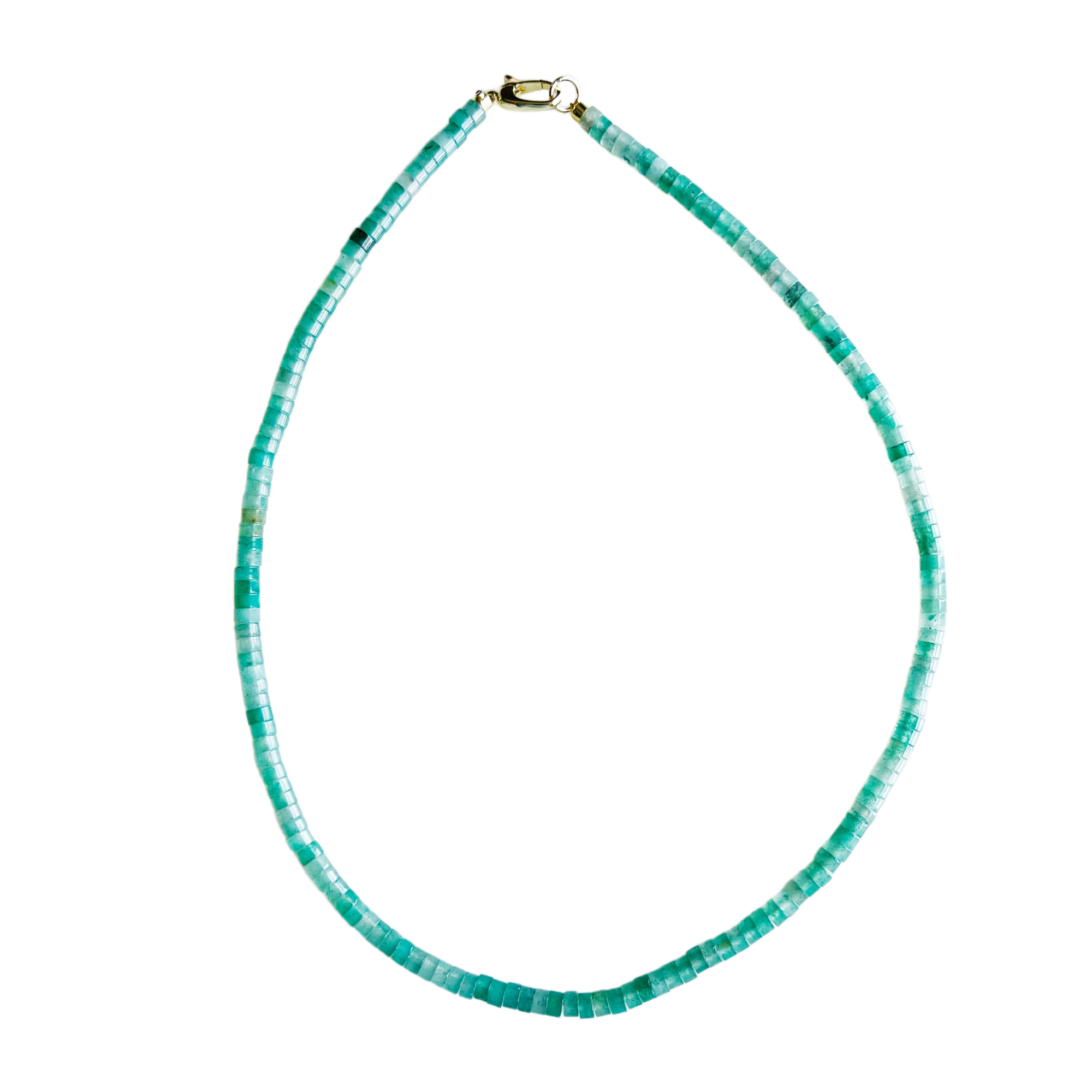 These necklaces are made with Gemstone Heishi beads in Charleston, South Carolina! Each one is made with 18kt gold plated hardware and is 16 inches long. These are perfect for layering, or add a charm to the center for a custom look.